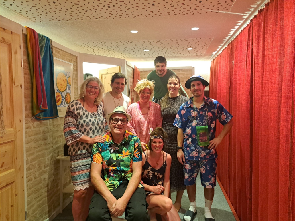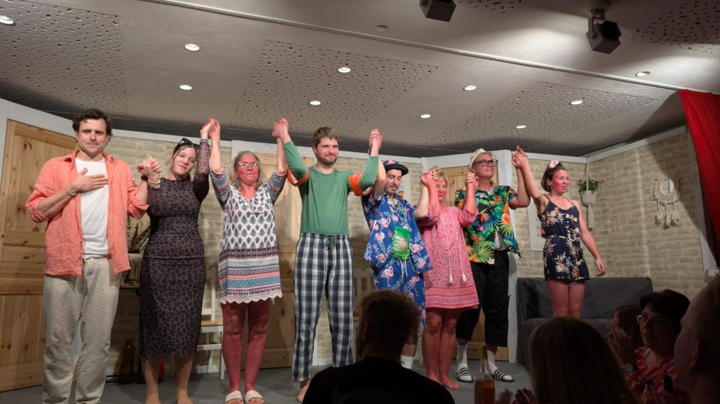 Mit tollem Timing und einer spürbaren Spielfreude steigerten sich die acht Darsteller – im wahrsten Sinne des Wortes – in einen Rausch und wurden dabei von Regisseur Alex Bross, Souffleuse Jasmin Jost und Moderator Stefan Kirchherr vor und hinter der Bühne unterstützt. Nicht zuletzt schuf das stimmige Bühnenbild den passenden Rahmen für die heißen Nächte und die kalten Füße auf der Bühne. Und so vergingen viel zu schnell die turbulenten Urlaubstage, bei denen flotte Dialoge, überraschende Wendungen und ein hohes Tempo Abend für Abend für beste Unterhaltung sorgten.