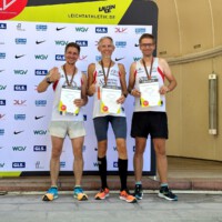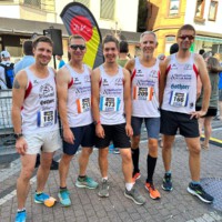 Erster von 3 Starts war der Lauf der Männer bis zur Altersklasse M45, bei dem 5 cool-runner teilgenommen haben. Dass dabei eine Medaille bei der Mannschaftswertung herausspringen würde, war im Vorfeld nicht unbedingt zu erwarten. Doch Markus Nippa (35:29 Min.), Rouven Lutz (37:15 Min.) und Domenik Behnke ( 39:16 Min.) trotzten den schweren Bedingungen und erkämpften sich den 3. Podestplatz und damit die Bronze-Medaille. Christian Diehlmann war es nicht möglich sein Potential auf die Straße zu bringen und finishte in für ihn ungewohnten 39:27 Minuten. Nur wenig mehr als 40 Minuten benötigte Thomas Schütz (40:41) gefolgt von U23-Läufer Sven Füller (42:01).